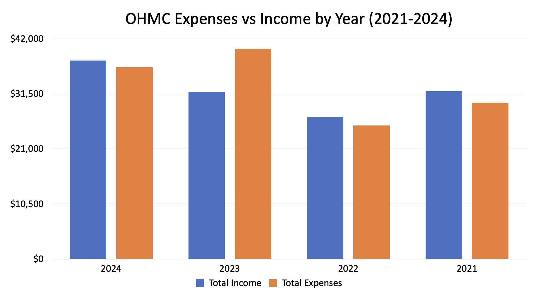 This chart provides a year-by-year comparison of OHMC's total income and expenses from 2021 to 2024, highlighting changes in financial balance and sustainability over time.