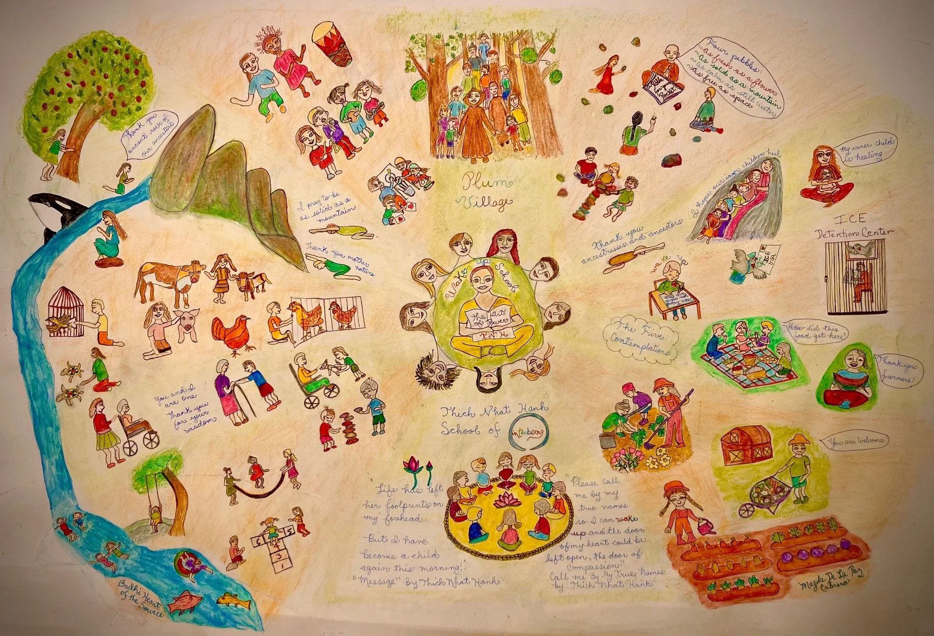 At a recent art exhibition I participated in at Cedar Lane Unitarian Universalist Congregation, I noticed a little girl speaking with Mary Smith from our sangha as they stood before my illustration, The Gifts for Little Girls. The piece is intricate, filled with many elements—including twelve girls—yet the child’s attention rested on a single small figure: a girl sitting quietly beneath Bodhisattva Quan Âm, meditating and receiving a dove from Avalokiteshvara. The moment quietly filled me with hope. I found myself imagining future generations receiving an education rooted in interbeing and the Wake Up spirit—children growing up in mindfulness and deep awareness.